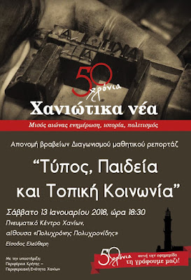 Το Σάββατο θα πραγματοποιηθεί η εκδήλωση απονομής των βραβείων του μαθητικού διαγωνισμού δημοσιογραφίας “Τύπος – Παιδεία και Τοπική Κοινωνία”, που διοργανώθηκε από τα Χανιώτικα νέα, με αφορμή τη συμπλήρωση 50 ετών από την πρώτη ημέρα κυκλοφορίας της εφημερίδας.