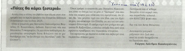 Είναι ο γνωστός μας Χανιώτης διανοούμενος Βαγγέλης Θ. Κακατσάκης, έκδοση Χανιώτικα νέα και Μουσείου Τυπογραφίας. Ως και στην καθηγήτρια Αιματολογίας- συγγραφέα Άννα Φιλιώτου για το μυθιστόρημα της “το ξετύλιγμα της δαντέλας” (εκδ. “λεξίτυπον”).